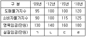 다음 표에서 어떤 도시근로자의 실질임금을 구할 경우 ㄱ, ㄴ, ㄷ, ㄹ의 크기를 바르게 나타낸 것은?