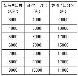 다음은 근로자의 노동투입량, 시간당 임금 및 노동의 한계수입생산을 나타낸 것이다. 기업이 노동투입량을 5000시간에서 6000시간으로 증가시킬 때 노동의 한계비용은?