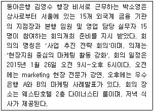 동아은행 박소영 비서는 다음과 같은 내용으로 회의를 준비하고 있다. 다음의 회의에 적합한 테이블 좌석배치 형태는?
