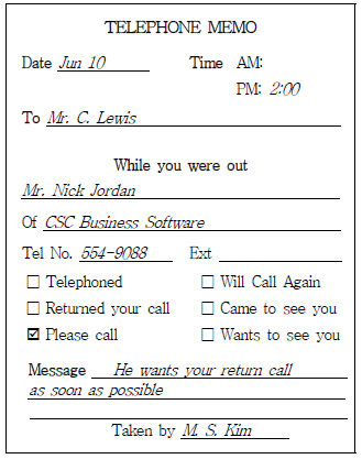 아래의 전화 메모에 해당되지 않는 내용은?