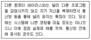 다음 설명에 해당하는 컴퓨터 바이러스는?