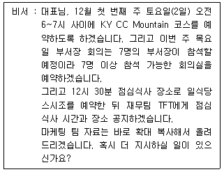 다음은 비서가 상사에게 일정을 보고하는 내용이다. 다음 중 6하원칙의 구분에 맞지 않는 것은?