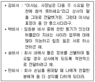 다음은 비서들이 인간관계 관리에 대해 나눈 대화이다. 이 중 가장 바람직한 경우는?