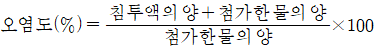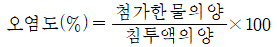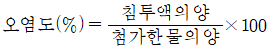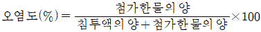 수세성 침투액에 대한 물의 오염을 측정하는 계산식으로 옳은 것은?