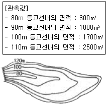 그림에 있어서 댐 저수면의 높이를 100m로 할 경우 그 저수량은 얼마인가? (단, 80m 바닥은 평평한 것으로 가정한다.)