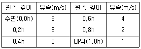 수심이 h인 하천의 평균유속을 구하기 위해 각 깊이별 유속을 관측한 결과가 표와 같을 때, 3점법에 의한 평균유속은?