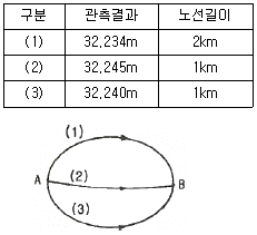 A, B점 간의 고저차를 구하기 위해 그림과 같이 (1), (2), (3) 노선을 직접 수준측량을 실시하여 표와 같은 결과를 얻었다면 최확값은?