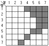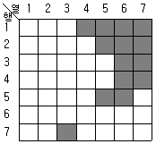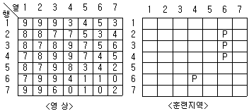 어느 지역의 영상으로부터 “논”의 훈련지역(training field)을 선택하여 해당 영상소를 “P”로 표기하였다. 이때 산출되는 통계값과 사변형 분류법(parallelepiped classification)을 이용하여 “논”을 분류한 결과로 적당한 것은?