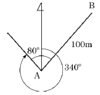 그림에서 A점의 좌표가 (100, 100)일 때, B점의 좌표는? (단, 좌표의 단위는 m이다.)