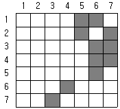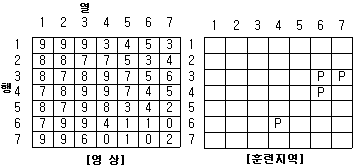어느 지역의 영상으로부터 “논”의 훈련지역(training field)을 선택하여 해당 영상소를 “P”로 표기하였다. 이때 산출되는 통계값과 사변형 분류법(parallelepiped classification)을 이용하여 “논”을 분류한 결과로 적당한 것은?