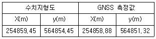 동일 위치에 대하여 수치지형도에서 취득한 평면좌표와 GNSS 측량에 의해서 관측한 평면좌표가 다음의 표와 같을 때 수치지형도의 평면거리 오차량은? (단, GNSS 측량결과가 참값이라고 가정)