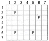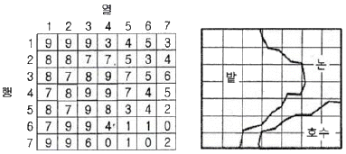 어느 지역의 영상과 동일한 지역의 지도이다. 이 자료를 이용하여 "밭“의 훈련지역(training field_을 선택한 결과로 적합한 것은?