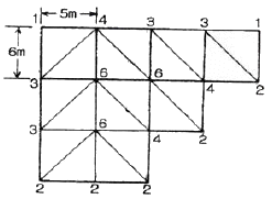 그림과 같은 지역의 각 점에 대한 시공기면에 대한 높이의 합이 ∑h1=0.40m, ∑h2=2.00m, ∑h3=1.00m, ∑h4=0.75m, ∑h6=1.20m이었다면 흙깍기 토량(절토량)은?