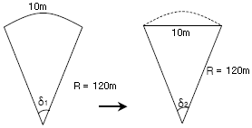편각법에 의한 단곡선의 설치에 있어서 그림과 같이 호의 길이 10m를 현의 길이 10m로 간주하는 경우, δ1과 δ2의 차이는 얼마인가? (단, 단곡선의 반지름(R)은 120m이다.)