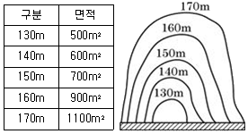 그림과 같이 계곡에 댐을 만들어 저수하고자 한다. 댐의 저수위를 170m로 할 때의 저수량은? (단, 바닥은 편평한 것으로 가정한다.)
