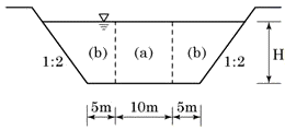그림과 같은 하천의 횡단면도에서 수심(H)일 때의 유량이 140m3/s, 단면적(a) 및 (b)의 평균유속이 각각 va=2.0m/s, vb=1.0m/s라면 이때의 수심(H)는? (단, 유량(Q)은 단면적(a), (b)의 유량(Qa, Qb)의 합과 같고, 하상은 수평이다.)
