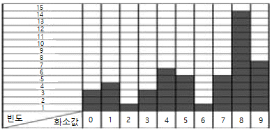 어느 지역 영상의 화소값 분포를 알아보기 위해 아래와 같은 도수분포표를 작성하였다. 이 그림으로 추정할 수 있는 해당지역의 토지피복의 수로 적당한 것은?