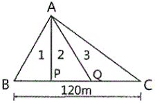 그림과 같이 삼각형의 정점 A에서 직선 AP, AQ로 △ABC의 면적을 1:2:3으로 분할하기 위한 BP, PQ의 길이는?