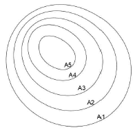 20 m 간격으로 등고선이 표시되어 있는 구릉지에서 구적기로 면적을 구한 값이 A5=200 m2, A4=250 m2, A3=600 m2, A2=800 m2, A1=1600 m2 일 때의 토량은? (단, 각주공식을 이용하고 정상부는 평평한 것으로 가정한다.)