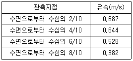 하천의 수면으로부터 수면에 따른 유속을 관측한 결과가 아래와 같을 때 3점법에 의한 평균유속은?