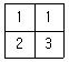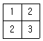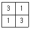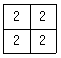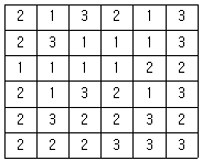 다음은 6×6 화소 크기의 래스터 데이터를 수치적으로 표현한 것이다. 이 데이터를 2×2 화소 크기의 데이터를 만들고자 한다. 2×2 화소 데이터의 수치값을 결정하는 방법으로 중앙값 방법(Median Method)을 사용하고자 할 때 결과로 옳은 것은?