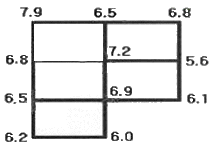 어느 지역의 토공량을 구하기 위해 사각형 격자의 교점에 대하여 수준측량을 하여 얻은 절토고(단위:m)가 그림과 같을 때 절토공량은? (단, 모든 격자의 크기는 가로 5m, 세로 4m이다.)
