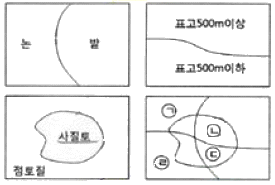 특용작물 재배 적합지를 물색하기 위해 그림과 같이 주제도를 만들었다. 해발 500m이상이며 사질토인 밭에 작물이 잘 자란다고 한다면 적합지로 옳은 것은?