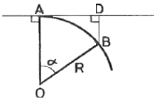 그림과 같이 단곡선에서 다음과 같은 측량 결과를 얻었다. 곡선반지름(R)=50m, α=41°40‘00“, ∠ADB=∠DAO=90°일 때 AD의 거리는?
