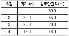 다음 표에서 성토부분의 총 토량으로 옳은 것은? (단, 양단면 평균법 공식 적용)