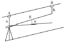 그림과 같이 터널 내의 천정에 측점을 정하여 관측하였을 때, AB 두 점의 고저 차가 40.25m이고 a=1.25m, b=1.85m이며, 경사거리 S=100.50m이었다면 연직각(α)은?