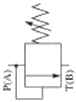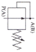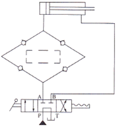 그림과 같은 회로를 이용하여 실린더의 전, 후진 운동속도를 같게 하려고 한다. 점선 안에 연결되어야 할 밸브의 기호는?