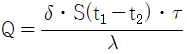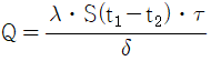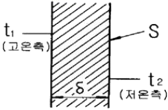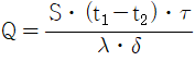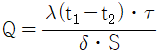 그림과 같은 고체 벽면에 의하여 열이 전달될 때 전달 열량을 계산하는 식은? (단, λ : 열전도율, S : 전열면적, τ : 시간, δ : 두께이다.)
