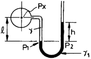 다음 그림과 같은 액주계 설치 상태에서 비중량이 γ, γ1이고 액주 높이차가 h일 때 관로압 Px는 얼마인가?