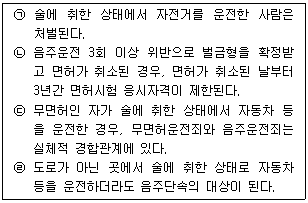 「도로교통법」상 음주운전과 관련된 내용이다. 아래 ㉠부터 ㉣까지의 내용 중 옳고 그름의 표시(O, X)가 바르게 된 것은? (단, '술에 취한 상태'는 혈중알코올농도가 0.05퍼센트 이상인 경우로 전제함)