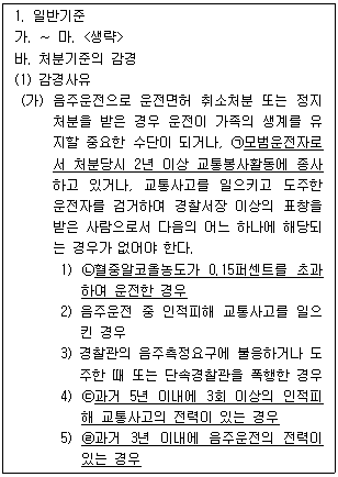 아래는 「도로교통법 시행규칙」 별표 28 운전면허 취소・정지처분 기준의 일부를 발췌한 것이다. 다음 중 옳은 것은?
