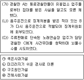 다음은 경찰관들의 일탈 사례와 이를 설명하는 이론(가설)이다. <보기 1>과 <보기 2>의 내용이 가장 적절하게 연결된 것은?