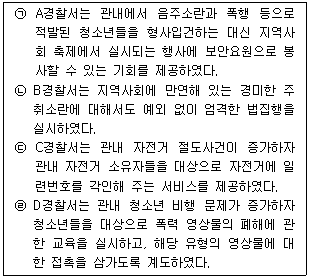 다음은 관할지역 내 범죄문제 해결을 위해 경찰서별로 실시하고 있는 활동들이다. 각 활동들의 근거가 되는 범죄원인론을 가장 적절하게 연결한 것은?