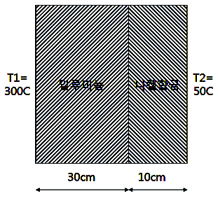 아래 그림과 같이 두 개의 평판이 겹쳐있을 때, 단위면적당 열전달량은? (여기서 알루미늄의 열전도율(Thermal Conductivity)은 k = 200 W/m-C이며, 니켈합금의 열전도율은 k = 20 W/m-C로 가정한다.)