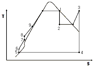 다음은 증기 사이클에 대한 이상적인 TS 선도를 나타낸 것이다. 각 위치에서 상태로 옳지 않은 것은?