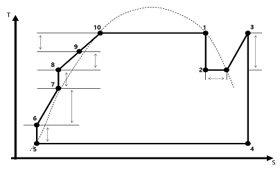 다음 그림은 가압경수로형 원자력발전소의 이론적인 T-S선도이다. 다음 T-S선도 각 구간에 해당하는 발전소 기기의 명칭이 옳지 않은 것은?