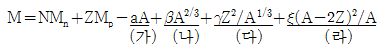 다음 식은 원자핵의 결합에너지에 대한 Wiezsäcker의 반경험적 질량 공식(액적모델 또는 Liquid drop model)을 나타낸다. 이 공식에 따르면 주로 질량수가 작은 핵종들에 대해 핵자 당 결합에너지의 오차가 발생하는데, 이러한 오차를 발생시키는 데 가장 큰 영향을 주는 것은 어느 항과 관려이 있는가?