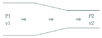 아래와 같은 형상의 관로에서 유체가 화살표 방향으로 통과할 때 올바른 것은? 단, P는 압력, v는 속도를 의미하며, 밀도는 일정한 것으로 가정한다.