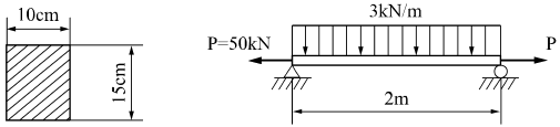 그림과 같은 직사각형 단면을 갖는 단순지지보에 3kN/m의 균일 분포하중과 축방향으로 50kN의 인장력이 작용할 때 단면에 발생하는 최대 인장 응력은 약 몇 MPa인가?