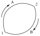 그림과 같이 상태 1, 2 사이에 계가 1→A→2→B→1과 같은 사이클을 이루고 있을 때, 열역학 제1법칙에 가장 적합한 표현은? (단, 여기서 Q는 열량, W는 계가 하는 일, U는 내부에너지를 나타낸다.)