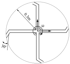 스프링클러의 중심축을 통해 공급되는 유량은 총 3L/s이고 네 개의 회전이 가능한 관을 통해 유출된다. 출구 부분은 접선 방향과 30˚의 경사를 이루고 있고 회전 반지름은 0.3m이고 각 출구 지름은 1.5cm로 동일하다. 작동 과정에서 스프링클러의 회전에 대한 저항토크가 없을 때 회전 각속도느 약 몇 rad/s인가? (단, 회전축상의 마찰은 무시한다.)