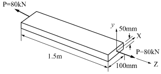 다음 막대의 z방향으로 80kN의 인장력이 작용할 때 x 방향의 변형량은 몇 μm인가? (단, 탄성계수 E=200 GPa, 포아송 비 v=0.32, 막대크기 x=100mm, y=50mm, z=1.5m이다.)