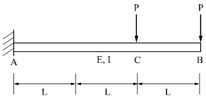 그림과 같이 전체 길이가 3L인 외팔보에 하중 P가 B점과 C점에 작용할 때 자유단 B에서의 처짐량은? (단, 보의 굽힘강성 EI는 일정하고, 자중은 무시한다.)