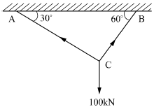 그림과 같이 강선이 천정에 매달려 100kN의 무게를 지탱하고 있을 때, AC 강선이 받고 있는 힘은 약 몇 kN인가?