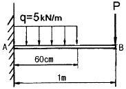 길이 1 m인 외팔보가 아래 그림처럼 q=5 kN/m의 균일 분포하중과 P=1 kN의 집중 하중을 받고 있을 때 B점에서의 회전각은 얼마인가? (단, 보의 굽힘강성은 EI이다.)