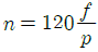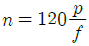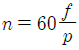 수차에 직결되는 교류 발전기에 대해서 주파수를 f(Hz), 발전기의 극수를 p라고 할 때회전수 n(rpm)을 구하는 식은?